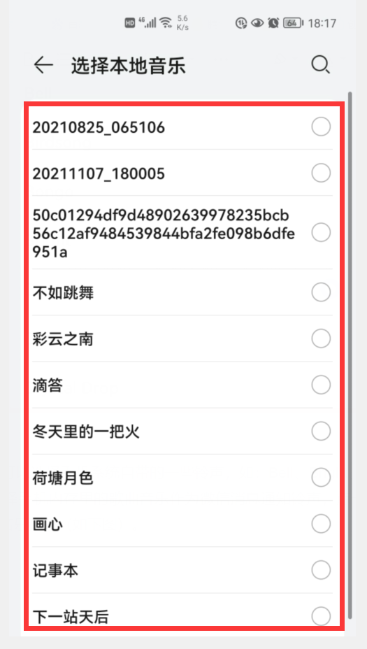 在这个界面,我们可以选择手机系统自带的一些铃声,如:Bell、Bright、Car Lock等等。当然,我们也可以选择下载到手机内存里的歌曲音乐,作为微信消息通知铃声,点击“选择本地音乐”选项,就会显示本地音乐列表(如下图)。