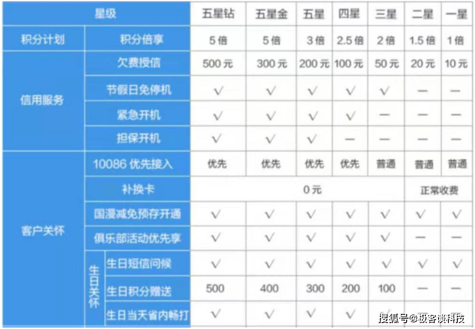 中国移动会根据用户的网龄、消费情况等评定出不同的星级用户,每个级别的星级用户享用的特权也不同。值得推荐的有欠费授信,不至于因为疏忽而导致的停机问题;移动在机场、火车的VIP候车室,可以进入休息等。期间积攒的用户积分,也可以在移动的积分商城兑换产品。